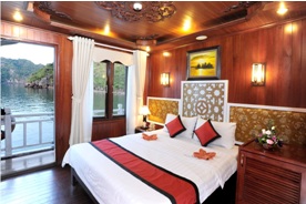 - Phòng nghỉ trên tầu sang trọng với điều hòa nóng lạnh, bồn tắm vòi hoa sen, tủ lạnh nhỏ.