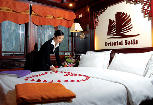 Khám phá Vịnh Hạ Long trên Oriental Sails - một tàu du lịch Hạ Long gồm 18 cabin sang trọng và một tính năng 8 cabin sang trọng nội thất trong phong cách cổ điển Việt. Đây 2 ngày hành trình vào vịnh Hạ Long huyền thoại và một phần vịnh Bái Tử Long bao gồm các hoạt động khác nhau mà thực sự sẽ cung cấp một kinh nghiệm thật sự độc đáo. Đó là tất cả tuyệt vời!