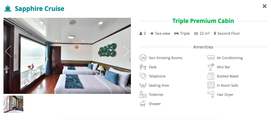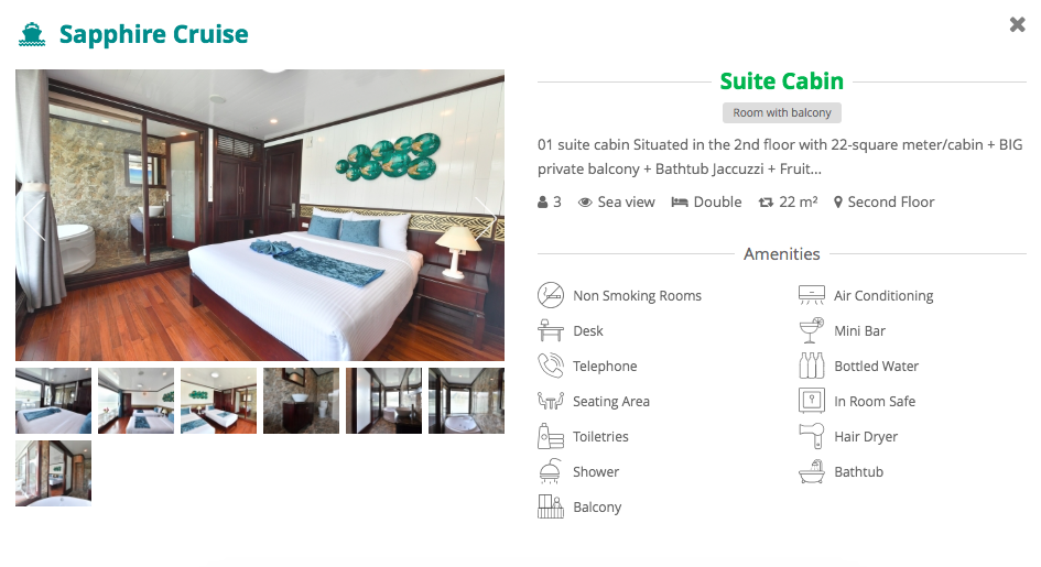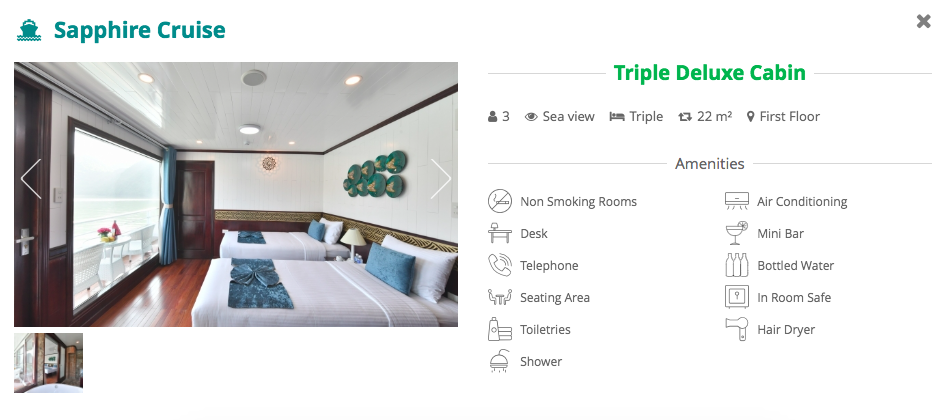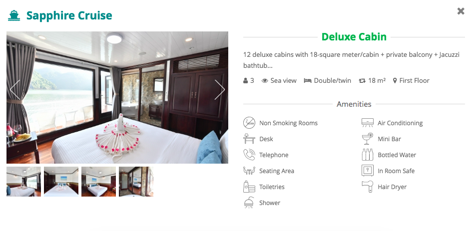 Activities: Hotel pick up, transfer to Got Ferrry (Hai Phong City), check-in Sapphire cruise, savor lunch onboard, kayak or swim in a quiet area in Lan Ha Bay, back to the main ship, relax and enjoy sunset, serving dinner, overnight onboard
