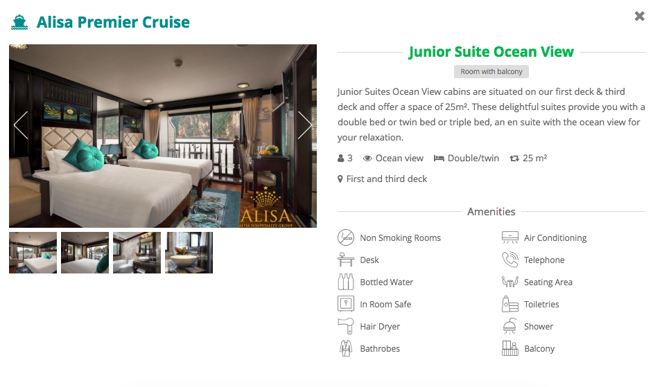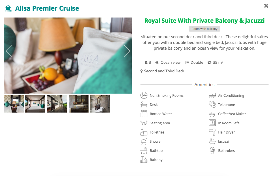 Activities: pick up hotel, transfer to Tuan Chau Marina, have lunch, visit titop, kayak or bamboo boat in Luon Cave, happy hour, have dinner, relax and enjoy movies, overnight on board