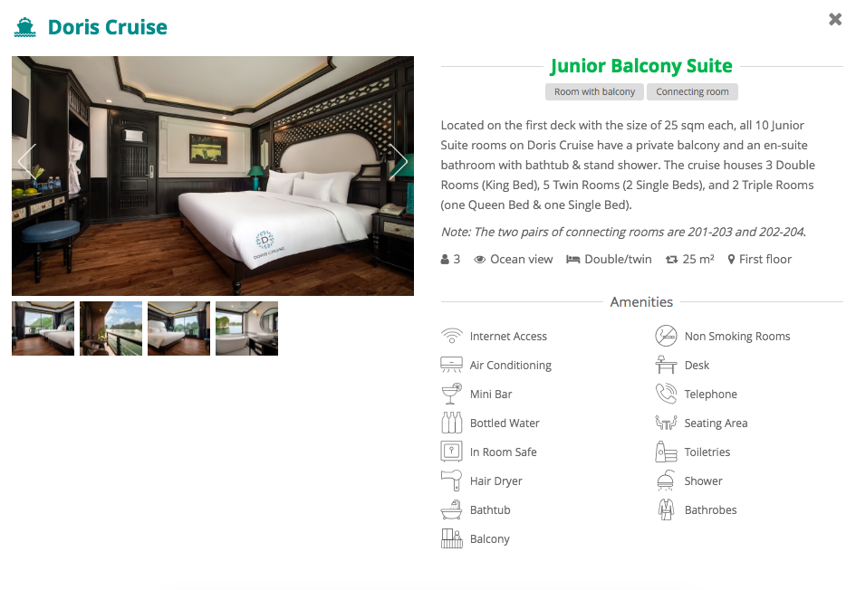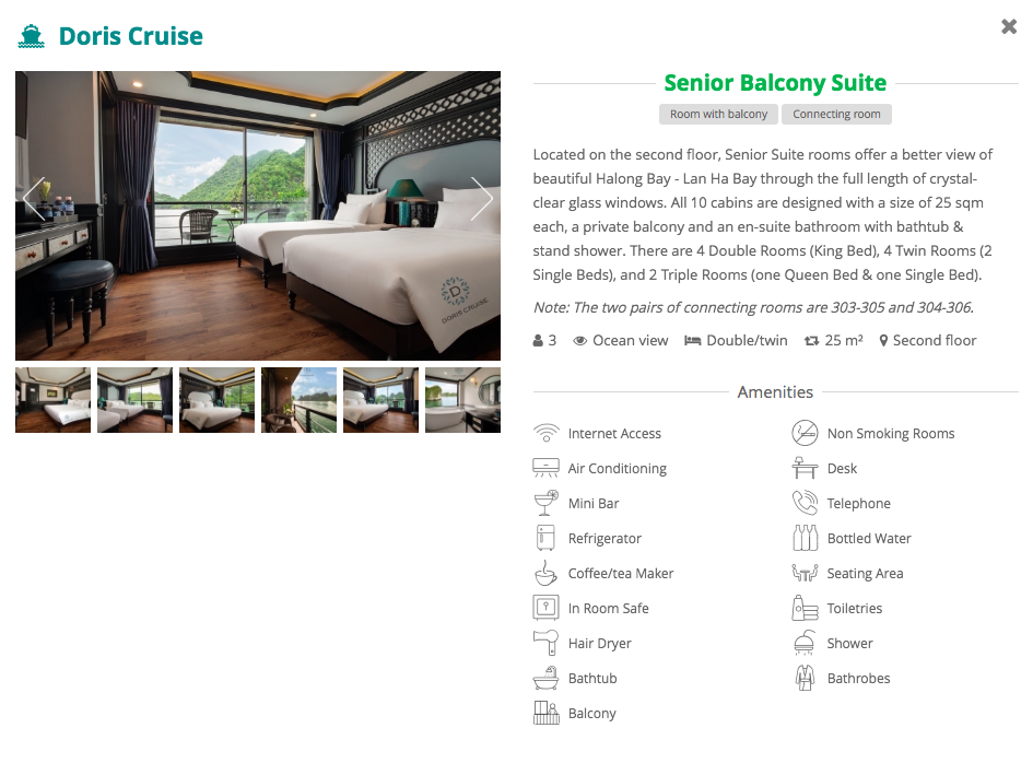12h00: Leaving Doris Cruise to get on the transfer boat back Tuan Chau Harbor dock 35. (If you book your own transfer, please inform driver be ready at dock 35 Tuan Chau 12h30 pm)