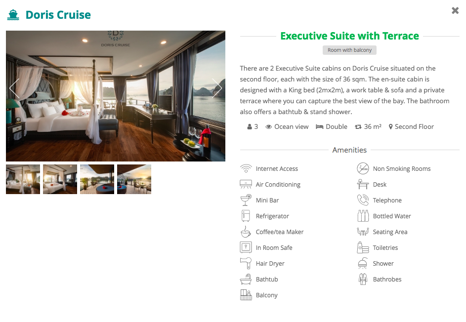 Activities: Hotel pick up, transfer to Tuan Chau Marina, check-in, transferred by speedboat to Doris Cruise, have lunch, swimming or kayaking in Tra Bau, Join cooking class, have dinner, evening entertainments