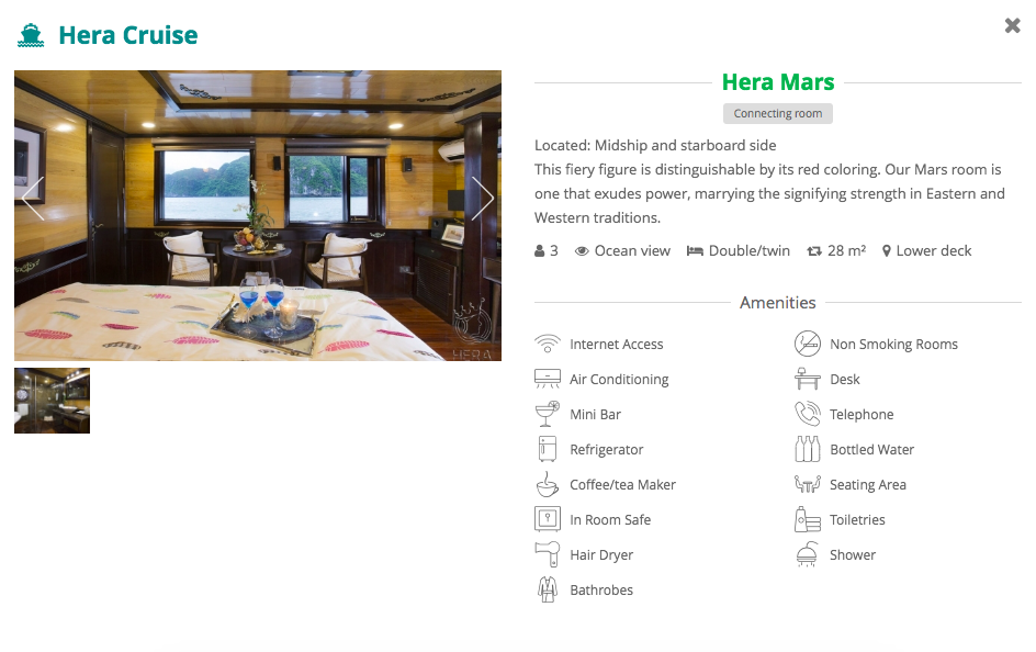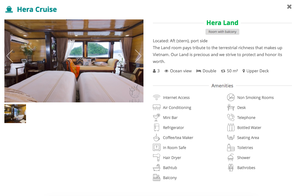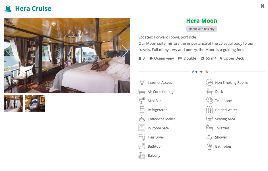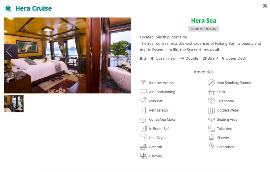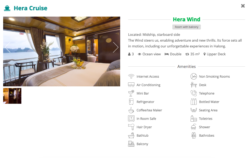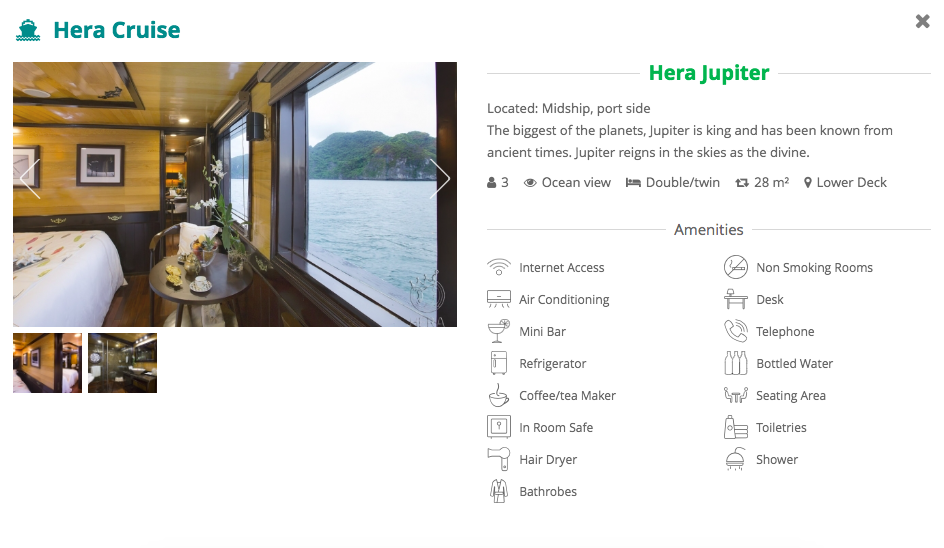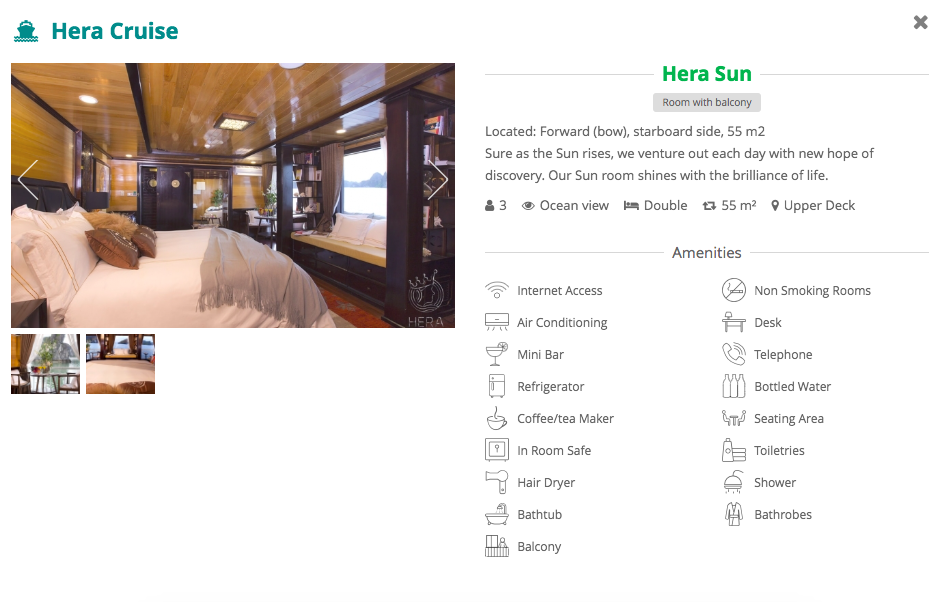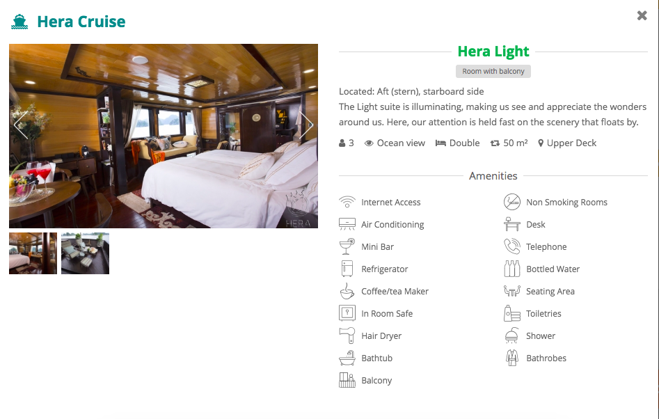 Activities: Driving to Halong, Arrive in Tuan Chau Port, Check in Hera Cruise, Welcome Drink, Having lunch while enjoying the natural beauty of bays, Cua Van fishing village, participating in Happy Hour, enjoying night activities