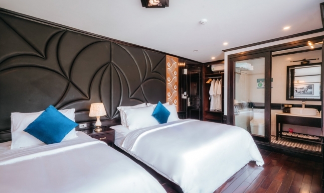 15.30 – 17.00: Continue cruising through Con Vit islet (Duck Islet), Thumb islet and Gia Luan Harbor. Discover lagoon natural area belonged to Lan Ha Bay. Drop anchor for swimming or just simply sunbathe on our cruise (private, wild and fresh air). Heading back toward the sleeping area. Do kayaking and swimming at Tra Bau area or use Jacuzzi (located on 3rd – sundeck).
