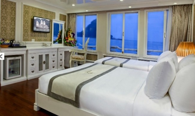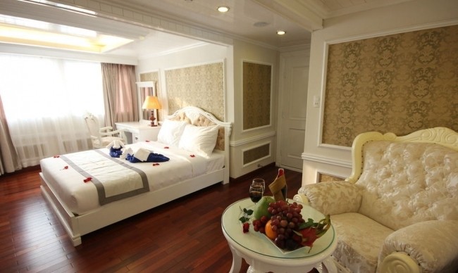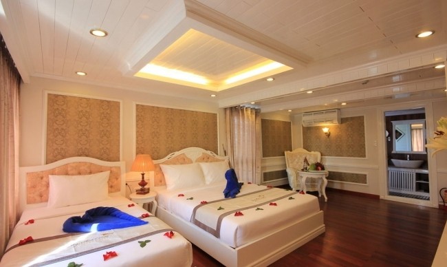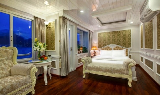 20:45 – 00:00: Your free time to relax with an exotic cocktail or whatever takes your fancy. Our bar has a wide range or wines, beers and liquors and is always a welcome sight for guests after a day on Halong Bay. Order a specialized massage in room. Choosing with other activities boat cruise such as watch documentary movies, squid fishing or simply relax on our roof top deck under the cover of a star filled sky.Meals:Breakfast, Lunch, Dinner