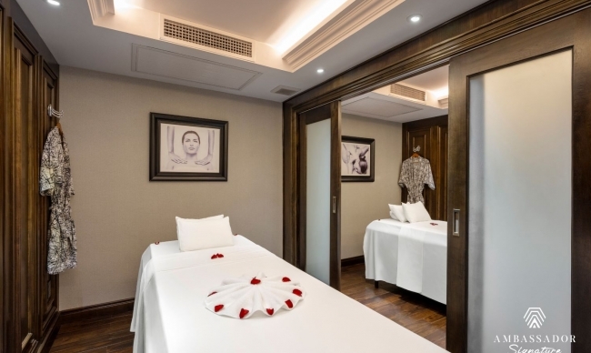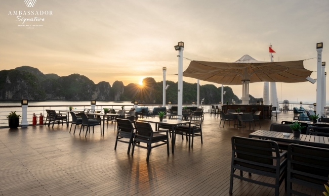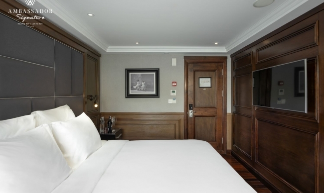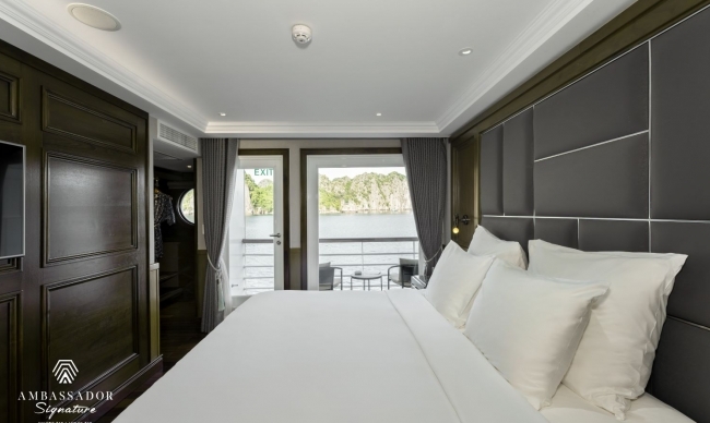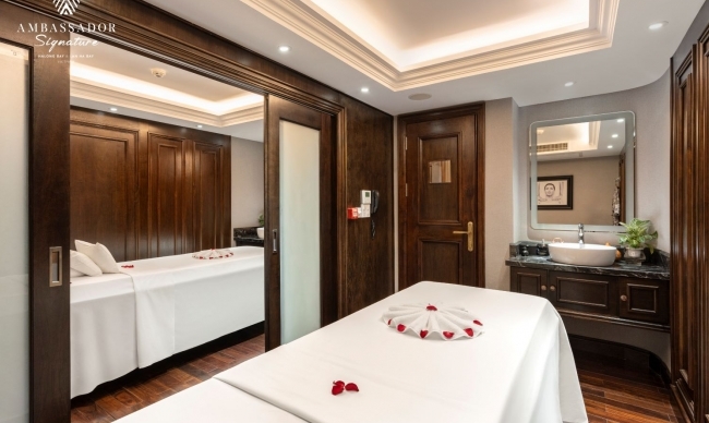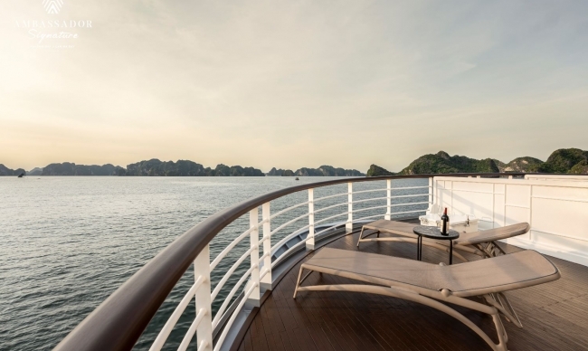 Step on board the elegant and opulent Ambassador Signature Cruise for an unforgettable journey as you discover Lan Ha Bay's magnificence. With 39 trendy and modern cabins and a capacity for 120 guests, this 5-star floating hotel has everything you need for a feel-at-home journey in the middle of the sea: air conditioning, private balconies, en-suite bathrooms, and bathtubs. Along with first-rate accommodation, Ambassador Signature also offers a premium Asian – European cuisine experience as well as a complete complement of modern facilities, including a luxury spa on board, a piano lounge, and a restaurant & bar.