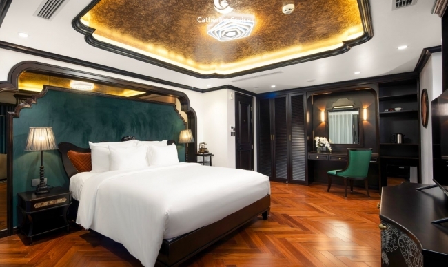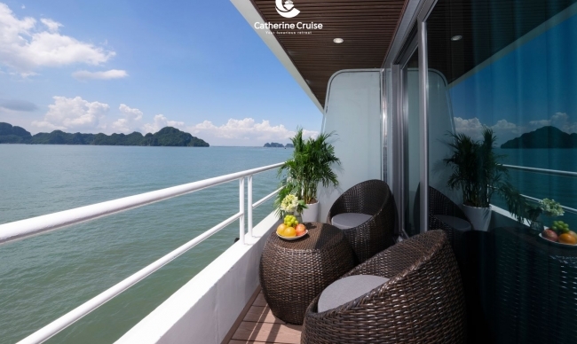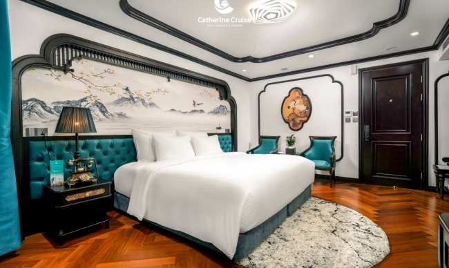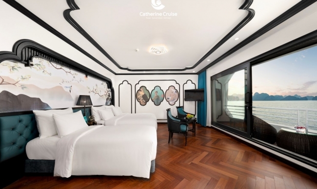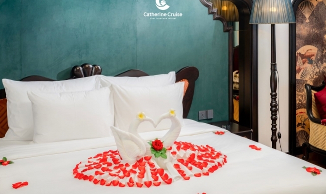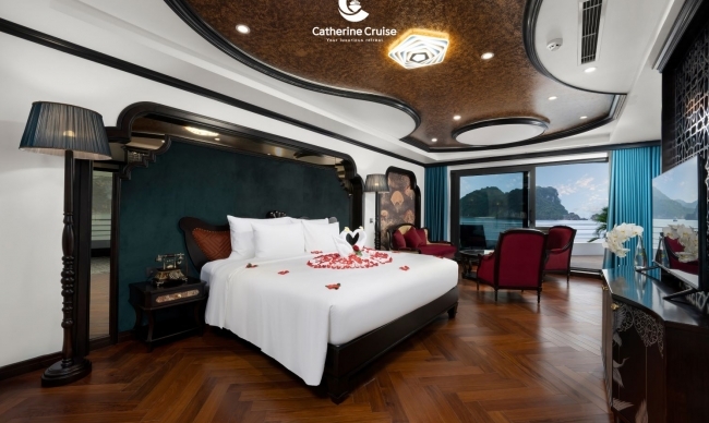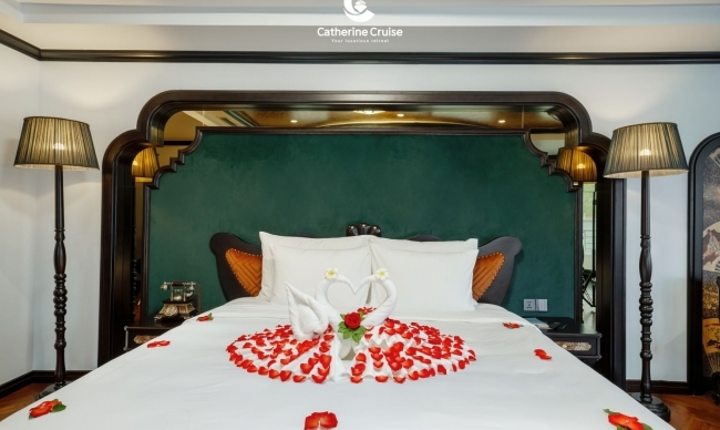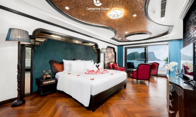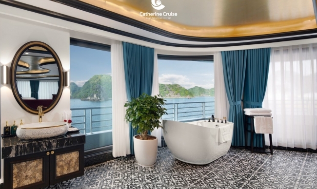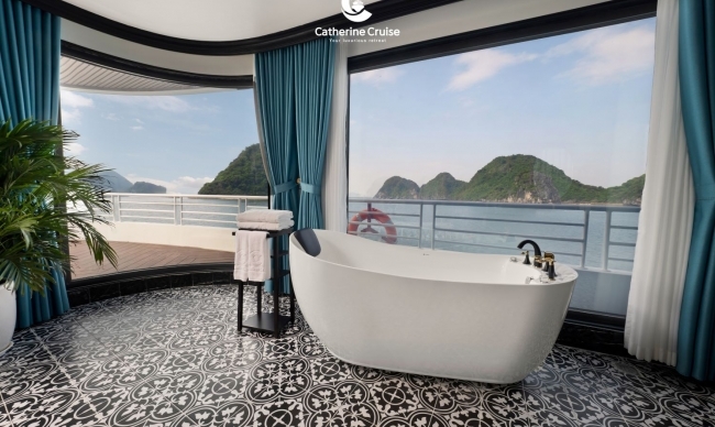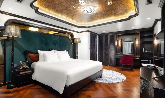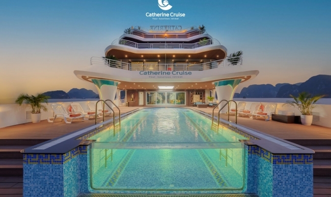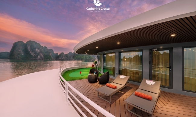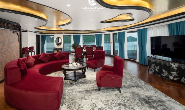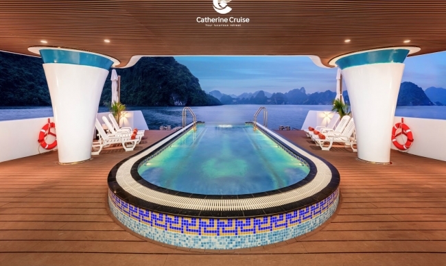 Scheduled to launch in June 2023, Catherine Cruise is a luxurious miniature resort floating in the turquoise water of Halong Bay. The cruise has a 6-star super-yacht appearance, combined of Indochine style illustrating through curving figures on the ceilings and abstract images, like the graceful beauty of Southeast Asian ladies. Besides the ability to accommodate up to 117 guests with 39 lavish cabins, Catherine will take your heart with a superb range of entertainment recreations onboard, namely Infinity Pool, Wine & Cigars Cellar, Karaoke rooms, Texas Hold’em Poker, Mini Golf Course… With a goal to preserve the natural beauty of Halong Bay, Catherine Cruise will surely bring guests an ext