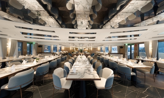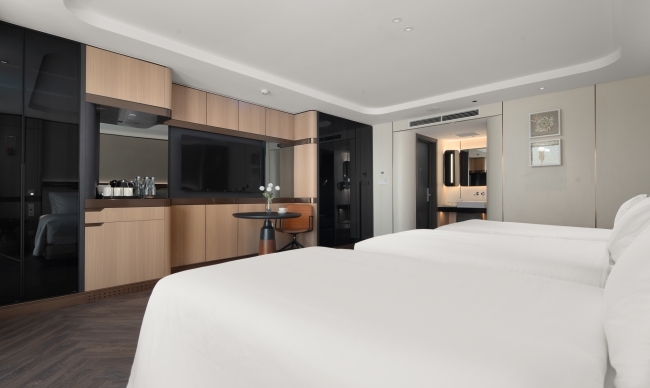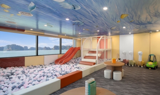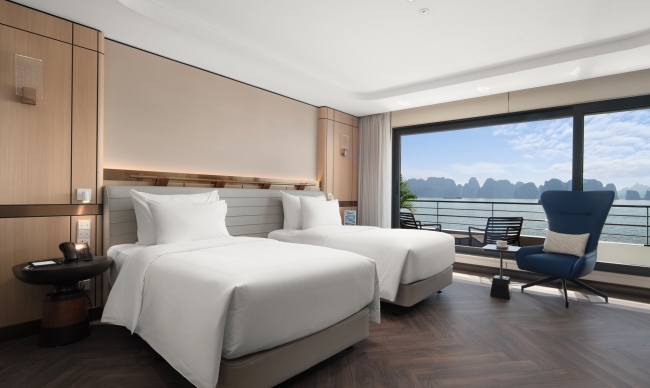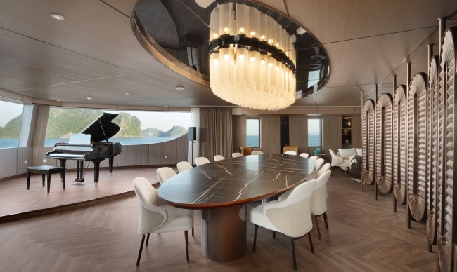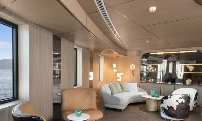 Supposed to be launched in the spring of 2023, La Siesta Superyacht is a new masterpiece of the Elegance Hospitality Group who are known for refined service and impeccable design with a chain of boutique hotels. The five-deck steel ship is designed with 56 elegant guest rooms and suites, making it the largest overnight ship in Halong Bay. The vessel also takes you to the most stunning destinations in different parts of the bay: Lan Ha Bay in the 2-day itinerary and Bai Tu Long Bay in the 3-day trip, which will surely offer authentic experiences for all guests onboard. But what will surprise you is a superb range of cutting-edge facilities to suit all needs, including a salt water infinity pool, golf simulator impact screen, a gym and yoga studio, a conference room, a wine & cigar lounge, a mini library and reading area; a kids’ club, etc. Immerse yourself in a spectacular experience of exclusivity, comfort, elegance, and style in a whole floating entertainment and leisure superyacht with La Siesta.