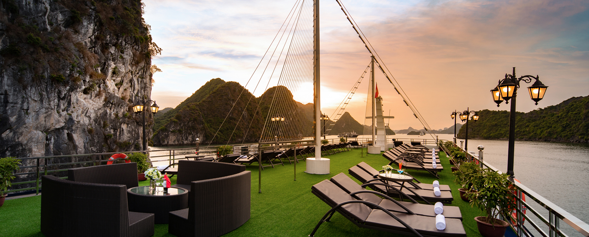 In the morning, the cruise departs from Tuan Chau or Bai Chay Harbor, gliding gently across the calm, green waters of Halong Bay. From the very first moment the ship leaves the dock, a magnificent view unfolds — towering limestone formations, drifting clouds, and shimmering reflections on the sea, creating a vivid and poetic landscape.