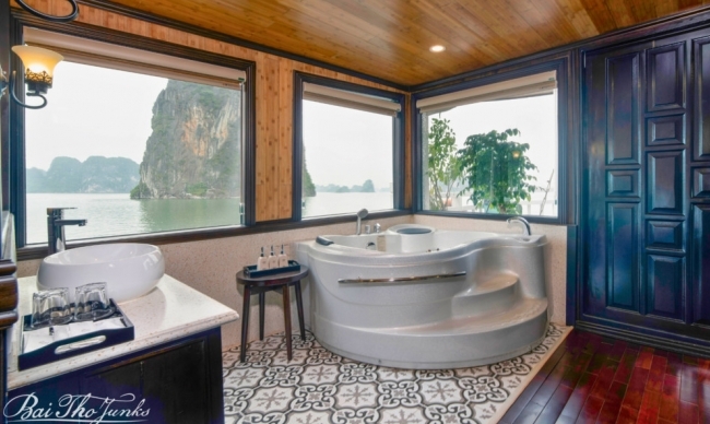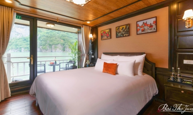 Activities: Hotel Pickup, arrive at Halong Internation Port, transfer to boat by tender, check-in, discover Luon Cave by kayak or bamboo boat and Titop Island, relax with massage services, experience squid fishing, overnight on board