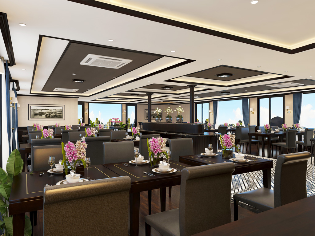- Các bữa ăn trên tàu được phục vụ với hải sản, phong cách Việt Nam và quốc tế. Du khách có những yêu cầu đặc biệt về thực đơn, dị ứng thực phẩm hay chế độ ăn kiêng xin vui lòng thông báo ít nhất 2 ngày trước ngày khởi hành.