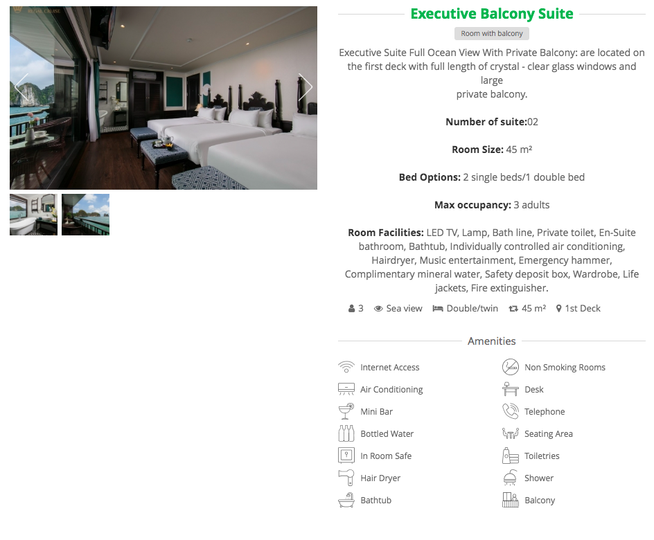 Hoạt động: Đón khách tại Hà Nội, đến Bến du thuyền Tuần Châu, Nhận phòng Genesis Regal Cruise, Đồ uống chào mừng, Ăn trưa trong khi thưởng thức vẻ đẹp thiên nhiên của vịnh, Khám phá đảo Cát Bà, Chèo thuyền hoặc chèo thuyền kayak trong Hang Sáng Tối, Tham gia nấu ăn trình diễn, tận hưởng hoạt động về đêm