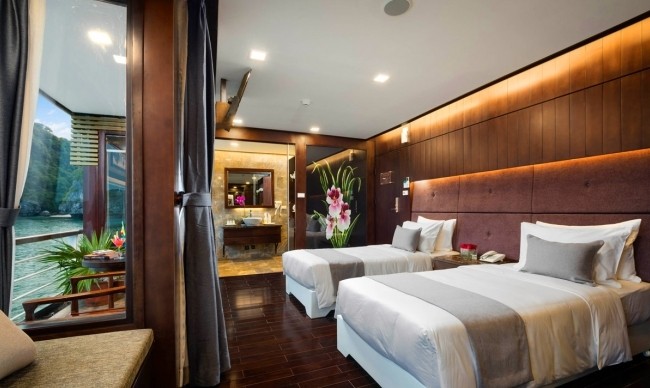 Du thuyền Orchid gồm các du thuyền có 14 cabin có thể tiếp đón 28 vị khách. Tại mỗi cabin đều được trang bị màn hình TV LED, điều hòa, nóng lạnh, phòng tắm với các thiết bị nội thất cao cấp và đầy đủ. Cửa sổ lớn tại mỗi phòng tạo sự thoáng mát, view toàn cảnh ngắm ra mặt vịnh cùng ban công riêng biệt, chắc chắn sẽ mang đến cho du khách những giờ phút thư giãn thoải mái và tuyệt vời nhất.