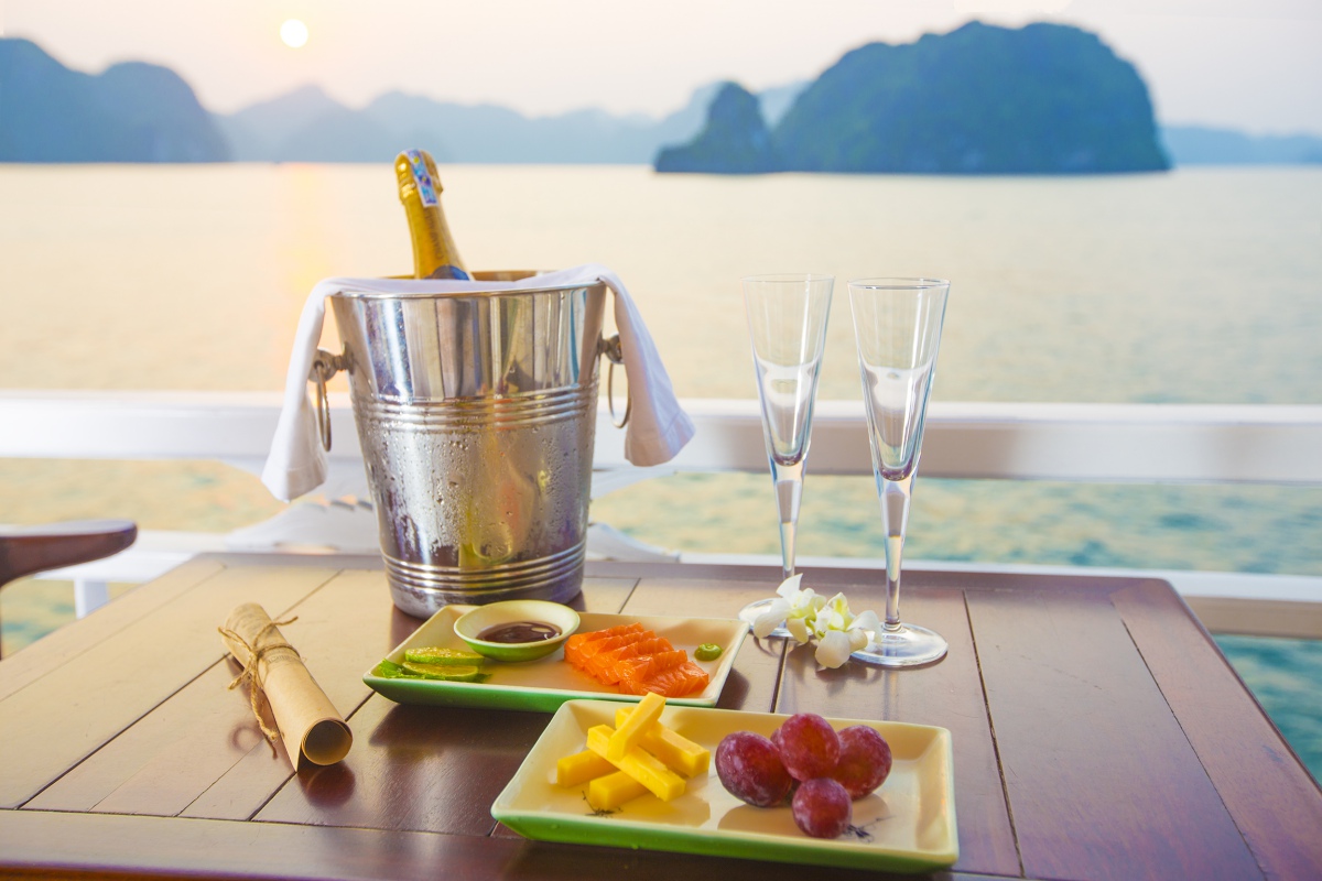 Bữa ăn miễn phí với thực đơn riêng trên du thuyền Hera Cruise.