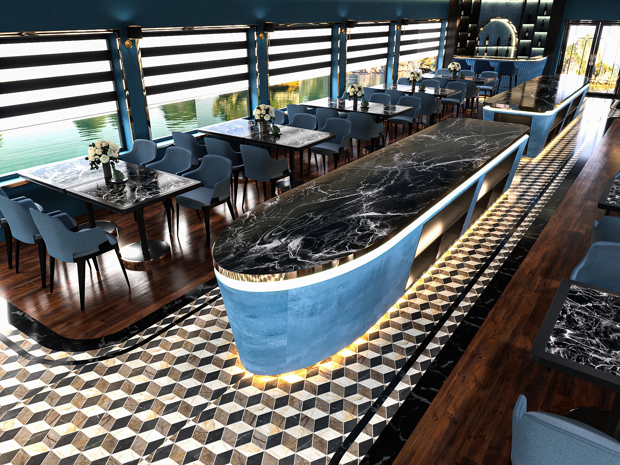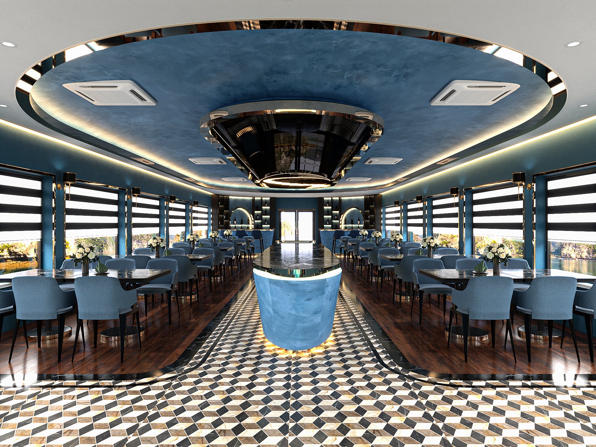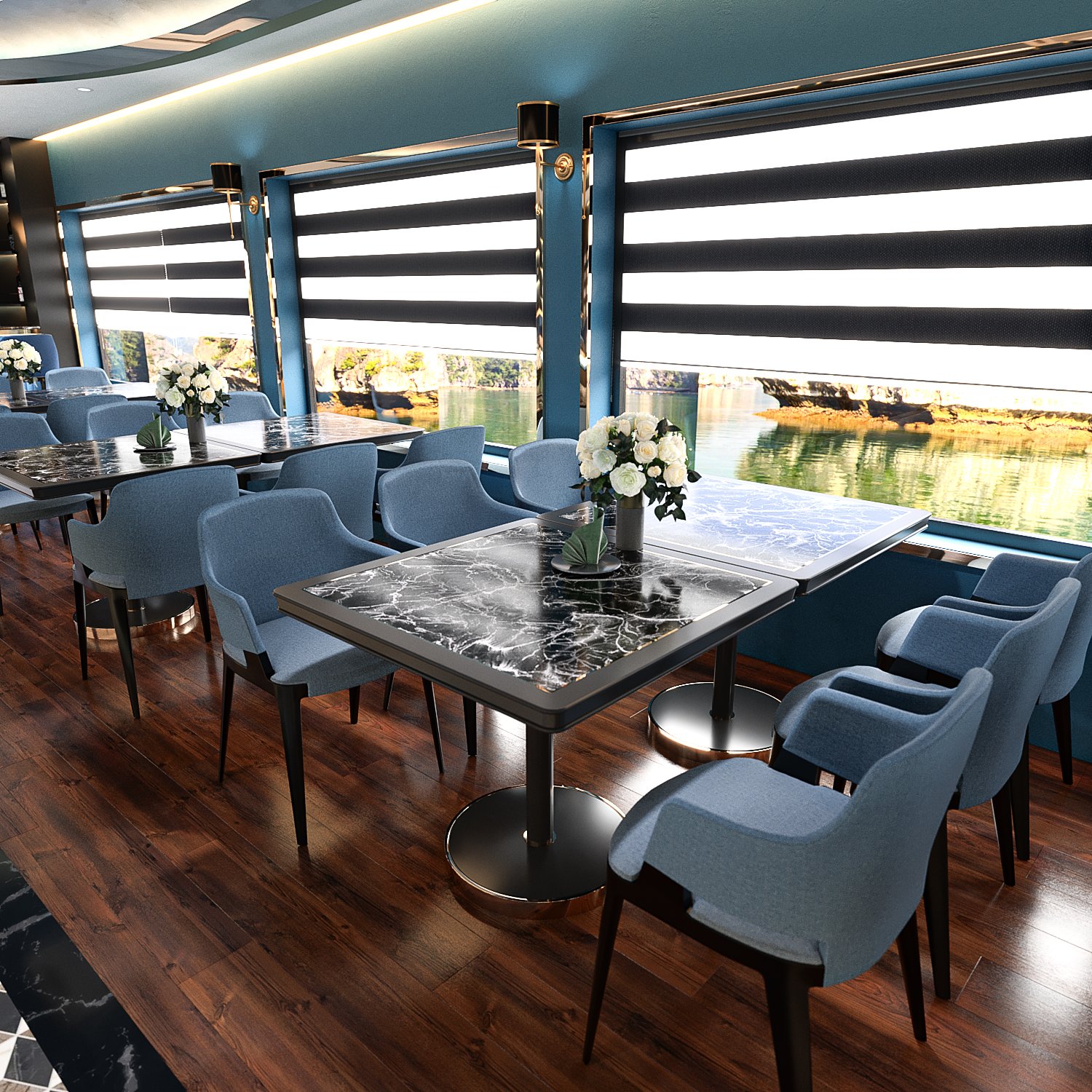 Nhà hàng rộng rãi với 2 quầy buffet cao cấp, thoáng mát, đảm bảo không gian riêng tư khi thực khách thưởng thức bữa ăn và thư giãn với khung cảnh tuyệt đẹp trên Vịnh Hạ Long.